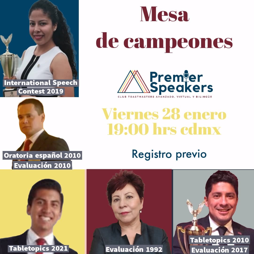 El viernes 28 de enero tuve la oportunidad de coincidir con 4 campeones de Distrito de nuestro país, en una Mesa de Campeones organizada por nuestra amiga Lucina Vázquez en el espacio del Club Premier Speakers